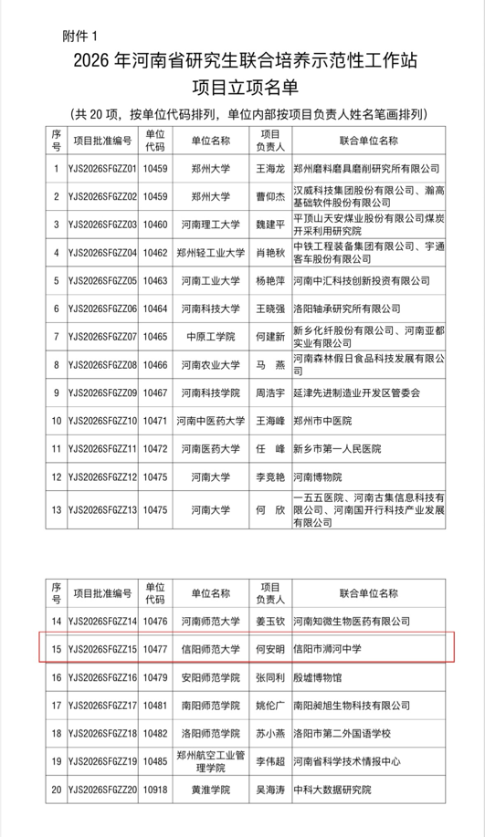 近日,河南省教育厅印发通知,由我院何安明教授牵头申报的“研究生联合培养示范性工作站(信阳师范大学—信阳市浉河中学)”成功入选河南省研究生联合培养示范性工作站立项名单,该工作站依托我院2022年获批的河南省研究生联合培养基地申报建设,联合信阳市浉河中学共建。