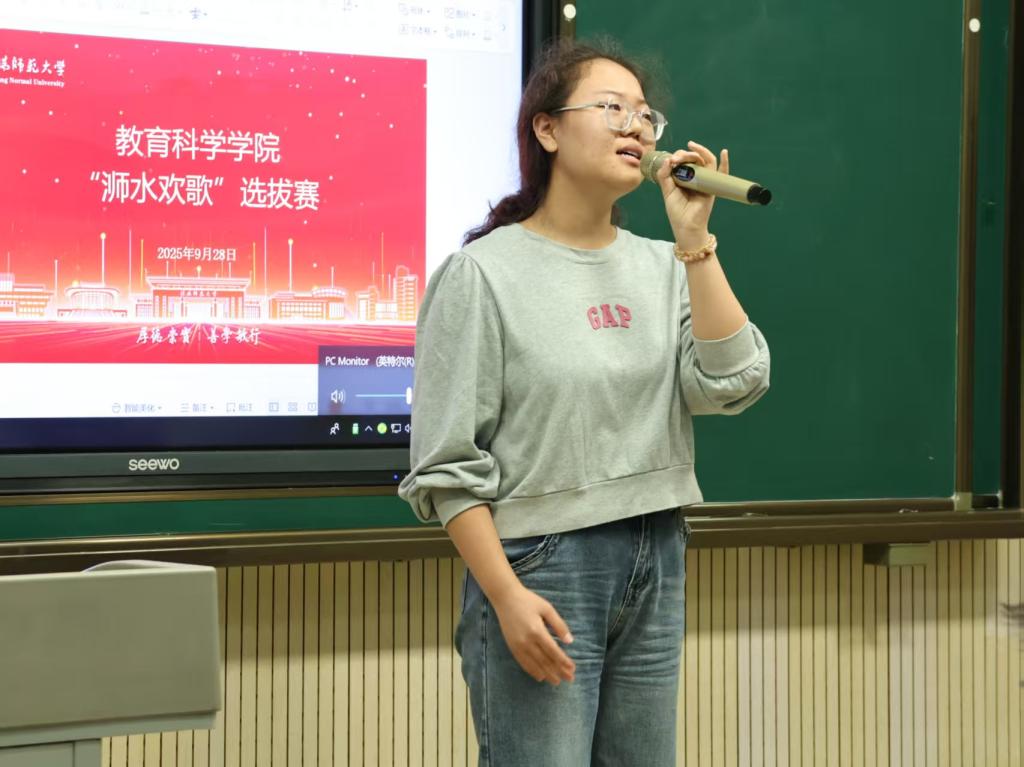 时间:2025-10-01 14:28:41 来源:教科院新闻宣传中心 作者:聂文双 阅读: 次为丰富学生业余文化生活,营造积极向上的校园文化氛围,9月28日,教育科学学院于教科楼205教室举办“浉水欢歌”选拔赛。本次比赛由教育科学学院团委书记杨艺卓、专业教师朱欲晓、何畔,以及音乐学院研究生高超共同担任评委。