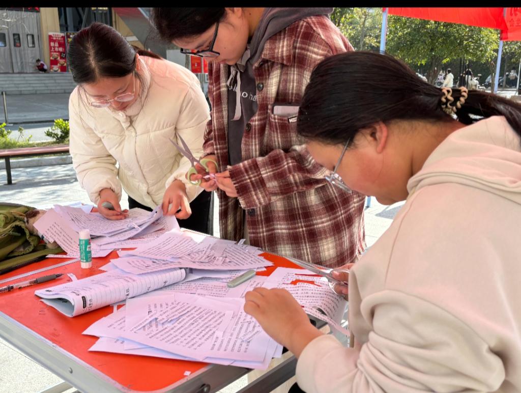 时间:2025-11-24 21:35:56 来源:教科院新闻宣传中心 作者:孟媛媛 阅读: 次为落实信阳师范大学“四季十美”大美育浸润计划,推进冬季美育工作走深走实,11月22日,教育科学学院于心语广场开展“字里寻韵,诗隙寻我”拼贴诗意活动。活动以创意文字为载体,鼓励同学们传递内心的勇气与热爱,由专职辅导员刘欣然、社团指导老师冯靖雯共同担任指导。