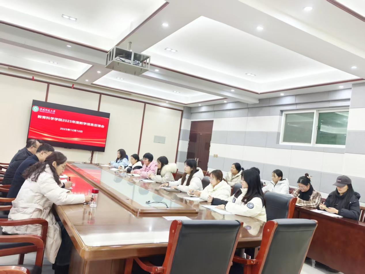时间:2025-12-16 21:41:15 来源: 作者:王婷 阅读: 次为深化本科教育教学改革,强化教学过程管理,精准掌握教学一线实际情况,12月16日,教育科学学院在教科402会议室召开2025年度教学信息反馈会。学院副院长郭勇,教学督导邢思珍、杨建朝、张耀庭,教学秘书刘萱,以及各年级教学信息员参会,共同为学院教学质量提升与学风建设建言献策。