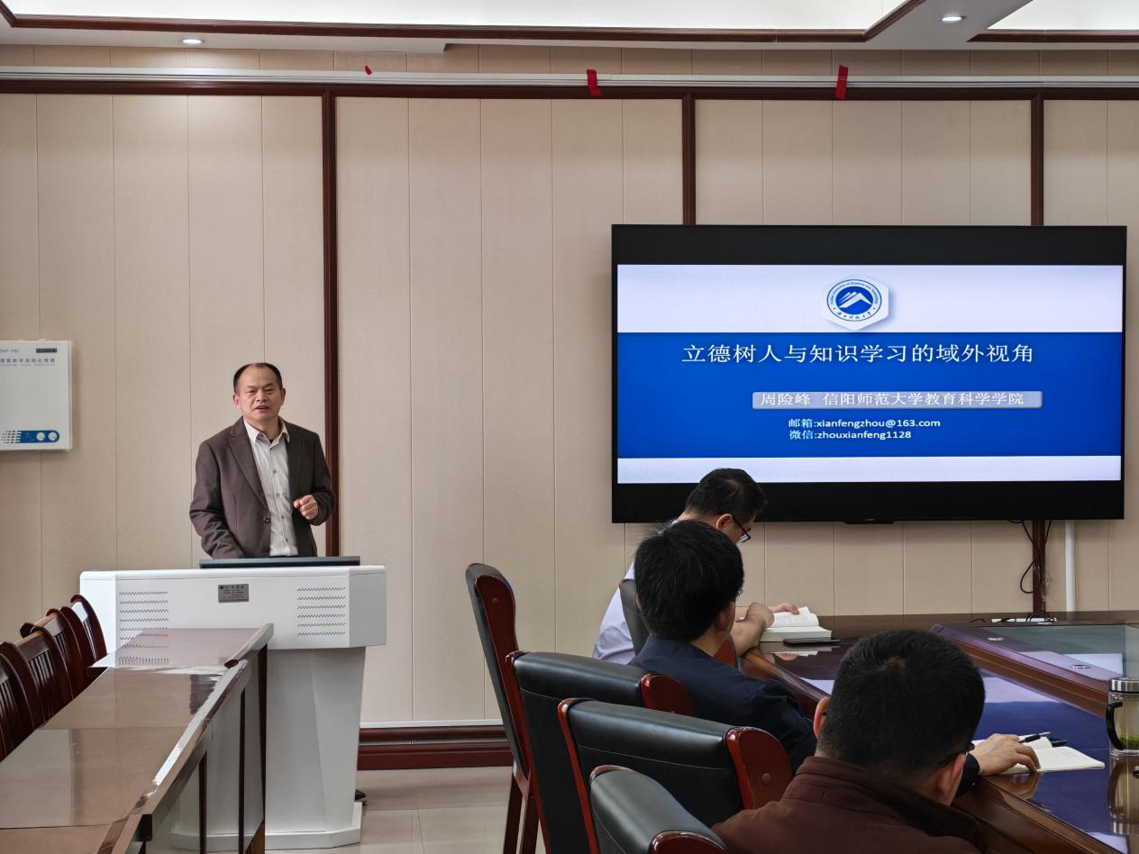 时间:2026-04-09 23:42:05 来源: 作者:常美慧 阅读: 次4月7日下午,共产党员先锋号“教育管理与政策”研究团队开展专题研讨会。会议特别邀请了教育学专业学科带头人、河南基础教育研究中心主任周险峰教授担任主讲人,作题为“立德树人与知识学习的域外视角”的学术报告。学院党委书记房加帅、教育系主任黄亚栋等近20位教师及研究生共同参会。