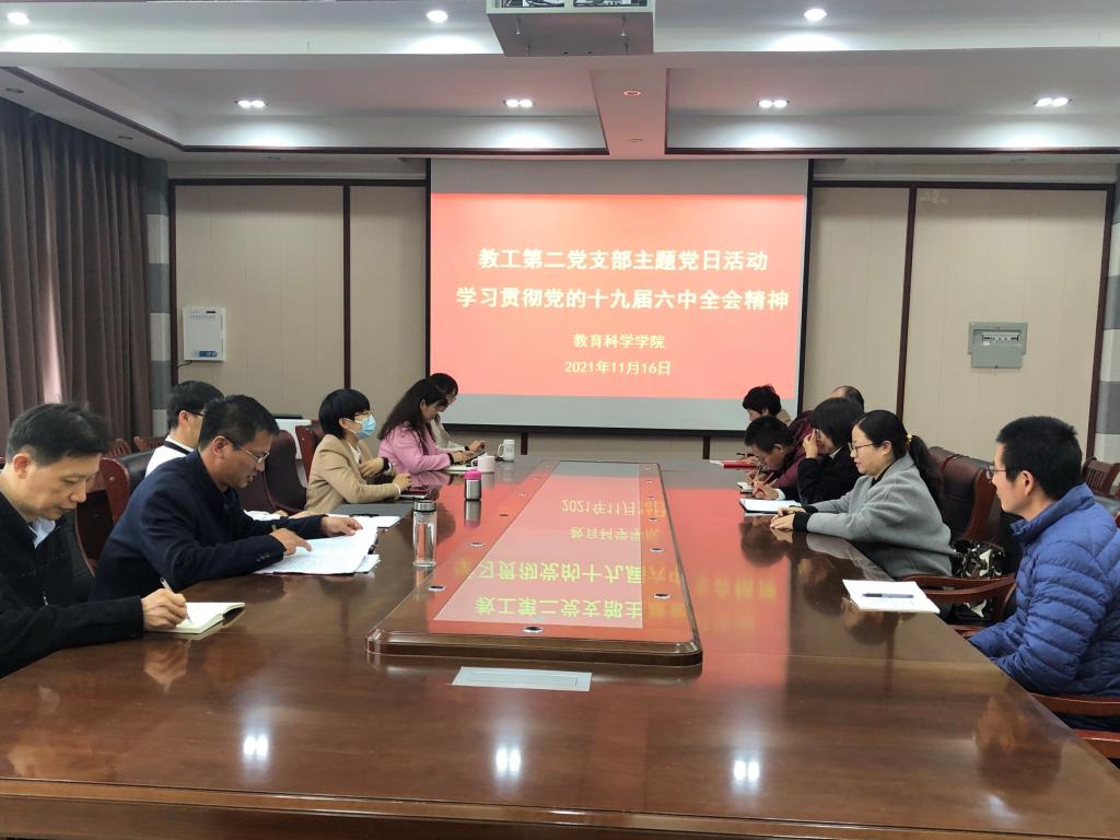 时间:2021-11-18 09:20:28 来源:教科院新闻部 作者:张纪娥 周媛媛 阅读: 次中国共产党第十九届中央委员会第六次全体会议于2021年11月8日至11日在北京举行。连日来,教育科学学院广大师生密切关注全会盛况,认真研读全会公报和习近平总书记的重要讲话,不断深入学习贯彻党的十九届六中全会精神,学院党委中心组、党支部分别开展全会精神学习研讨活动。